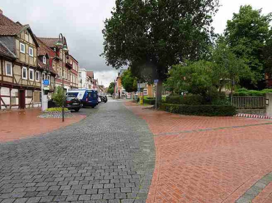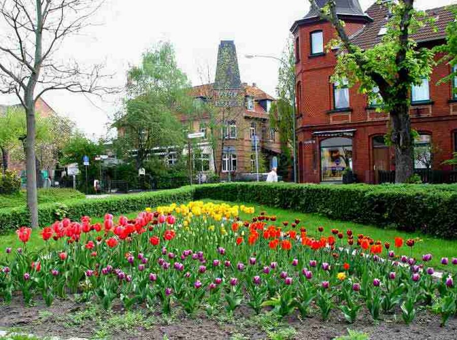 Sehen wir wieder auf den Platz. Er ist bestimmt durch seine Gegensätze Die Bäume stehen gegen das Denkmal. Die mediterranen Bauten sehen verständnislos auf die schlichten Backsteinhäuser, und beide voller Hochmut auf das alte Bauernhaus, die verkehrsreichen Straßen bedrängen das kleine grüne Herz. Eine Neugestaltung müsste diese Gegensätze befrieden. Mit dem Klimawandel im Blick könnte er unter vielen schattigen Bäumen einen erholsamen Aufenthalt bieten.