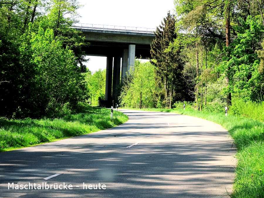 Die erste war die "Maschtalbrücke“. "Der erste Spatenstich erfolgte am 15.2.1935. Die Baustelle wurde geräumt am 15.9. 1935. Somit war diese Bauwerk in der sehr kurzen Zeit von nur sieben Monaten errichtet.“1 Die Brücke überquert mit acht Halbkreisbögen von 12 Meter Weite das Tal mit insgesamt 133,52 Metern. Der zweite östliche Bogen hat die größte Höhe von 10,78 Metern.