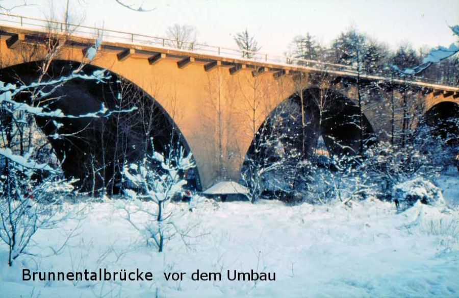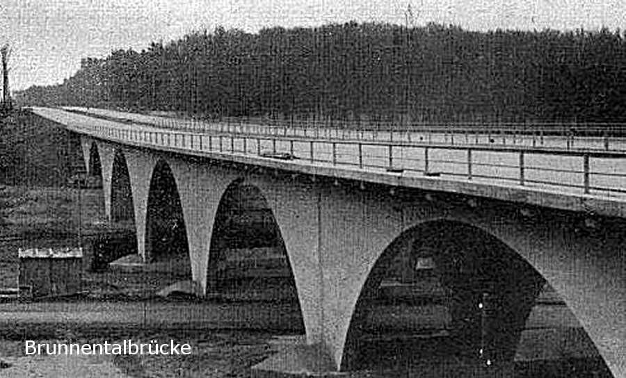 Die Brunnentalbrücke kam im Jahr darauf. "Der erste Spatenstich erfolgte am 20. Februar 1936, die Ausrüstung der zweiten Brückenhälfte am 7. September 1936, so daß dieses große Bauwerk in der sehr kurzen Zeit von nur 7 Monaten errichtet war.“ (1) Sie verläuft über 5 weite Bögen mit der höchsten Höhe des mittleren Bogens von 12,35 Metern über eine Gesamtlänge von 152.74 Metern.