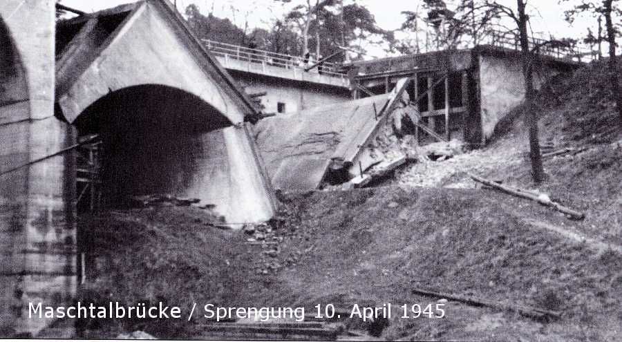 Die Existenzfrage der Brücken stellte sich am Ende des Krieges. Um den Vormarsch der alliierten Truppen aufzuhalten, sollten die Brücken gesprengt werden. Die Sprengsätze waren angebracht. Der östliche Bogen der Maschtalbrücke wurde am 10. April 1945 gesprengt worden. In letzter Minute konnten die Sprengtrupps von der völligen Zerstörung beider der Brücken abgehalten werden.