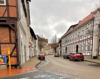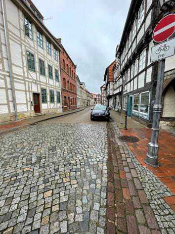 Auch an der erhaltenen zwei- bis dreigeschossigen Bebauung ist der einstige hohe Rang dieser Straße noch abzulesen. Es hat sich eine Reihe bemerkenswerter Häuser erhalten, von denen einige zu den ältesten Helmstedts gehören. Zuerst ist hier Nr.23 aus dem 16.Jh. zu nennen, mit Fächerrosetten, späterem massiven Erdgeschoß und Säulenportal. Etwa zur gleichen Zeit entstand Nr.7, ein ebenfalls sehr stattlicher, allerdings stark veränderter Bau, dasselbe gilt für Nr.13, vom Anfang des 16.Jh., der durch ein prächtiges Portal des 17.Jhs., im massiven Erdgeschoß ausgezeichnet ist. Mit den übrigen bescheideneren Bauten bietet sich ein sehr geschlossenes, von Fachwerkbauten des 16. bis 19.Jhs., bestimmtes Straßenbild, das nur von zwei schmalen Gassen unterbrochen wird.
