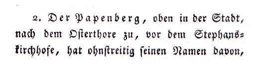 Auf der Höhe des Papenberges im Südosten der Stadt erhebt sich die Stephani-Kirche, die schon zur ersten, um die Mitte des 11.Jh. angelegten, Marktansiedlung gehörte. Ursprünglich wurde er einfach Berg (mons) genannt. Den Beinamen nach den dort wohnenden Pastoren (Pfaffen, niederdeutsch Papen) erhielt er erst nach dem 14.Jh.