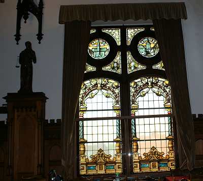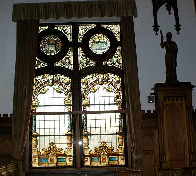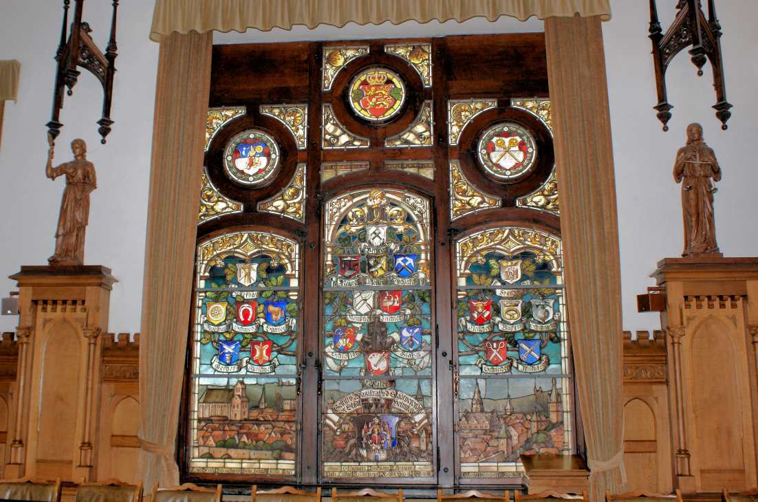 Am 20. Dezember stimmte die Stadtverordneten-Versammlung unter dem Vorsitz des Oberamtsrichters Kruse diesem Vorschlage zu, und bereits am 24. Dezember ging das Geld von der Kreiskommunalkasse bei der Stadtkasse ein. Ein weiterer Betrag wurde von anderer Seite gestiftet. Im neuen Sitzungssaal waren drei Fenster vorgesehen. Nach dem Voranschlag sollten "2 Stück zweiteilige Fenstergruppen, 2,40 m breit und 4,00 m hoch, anzufertigen und einzusetzen, jedoch ohne Verglasung, zu ölen und zu lackieren" 340 Mark, und "ein Stück dreiteilige Fenstergruppe, 4,00 m breit und 4,50 m hoch, sonst wie vor “300 Mark kosten. Diese Beträge waren also für die Rahmen vorgesehen, nicht aber, wie sonst bei den meisten anderen Fenstern, für die Verglasung. Diese wurde - laut Rechnung vom 20. September 1905 - von einer Kunstanstalt für Glasmalerei in Quedlingburg, dem Hoflieferanten Ferdinand Müller, geliefert. Das große Mittelfenster "im Stadtverordnetensaal mit gemalter Stadtansicht und gemaltem Eichbaum mit den Wappen der Handwerker" kostete 1.500 Mark, während sich die beiden Seitenfenster "ebenda mit reicher Ornamentmalerei, die Oberfelder mit gemalten Stadtansichten als Einlagen" auf zusammen 1.100 Mark stellten. Den Betrag von 1.500 Mark stifteten, wie aus einer Bemerkung des Baurats Schellenberg auf der Rechnung hervorgeht, der Magistrat und die Stadtverordneten. Aus den Akten ist darüber weiter nichts ersichtlich; die beiden Gremien werden diesen Beschluss in einer nicht offiziellen Besprechung gefasst haben, da er ja eigentlich eine Privatsache war. Die Namen der Stadtverordneten sind fortlaufend am unteren Rande des großen Mittelfensters angebracht, darüber die Namen des Stadtmagistrates, der sich aus dem Bürgermeister Franz Schönemann und den beiden Stadträten Max Dieckmann (Gutsbesitzer, Edelhöfe 2) und Heinrich Lehrmann (Kreismaurermeister), der sich gerade das große Haus an der Parkstraße gebaut hatte, das später als Burse diente und heute einen Teil der Kreisverwaltung aufgenommen hat, zusammensetzte.