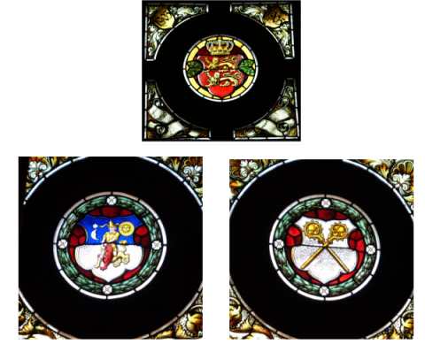 Die beiden anderen Fenster links und rechts im Rathaussaal sind weit weniger reichhaltig ausgestattet; sie zeigen nur im oberen Teil bildliche Darstellungen. Im Übrigen bestehen die Butzenscheiben aus farbigem Glas, die mit Blei eingefasst sind. In den Medaillons im linken Fenster sehen wir die Stephanikirche und das alte Stadthaus, darunter die Bilder von Dietrich Lichtenstein und Adolf Hartwieg; diese beiden Männer waren von 1744-1773 bzw. von 1874–1879 Bürgermeister von Helmstedt. In den Medaillons des rechten Fensters sind das Juleum und der Hausmannsturm abgebildet, darunter die Bildnisse der Bürgermeister Hildebert Guericke (1879-1898) und Franz Schönemann (1898-1918).