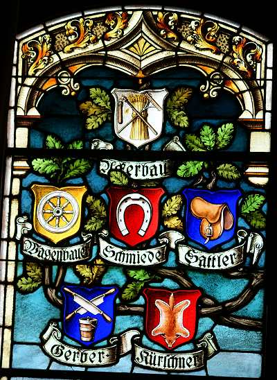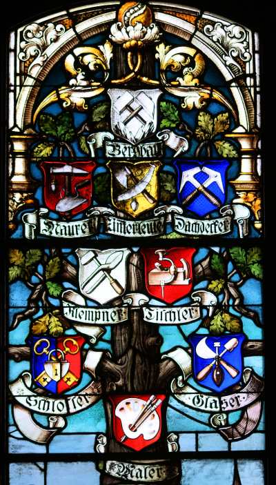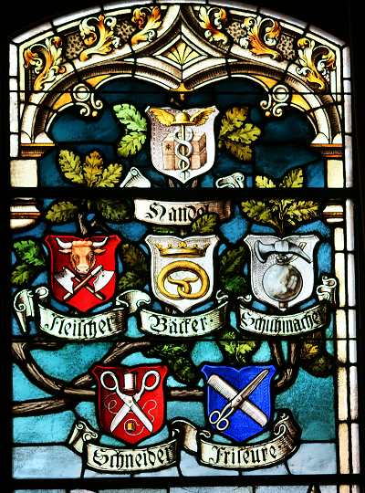 Unter diesen Wappen sehen wir dann, symmetrisch über die Fläche des Mittelfensters verteilt, die Namen und Zeichen verschiedener Industrie- und Handwerkszweige: den Bergbau mit Schlegel und Hammer, die Maurer mit Hammer und Kelle, die Zimmerer mit Winkel und Beil, die Dachdecker mit den gekreuzten Schieferhämmern, die Klempner mit Zange und Lötkolben, die Tischler mit der Zwinge, die Schlosser mit Hammer und Zange. Die Glaser mit dem Diamanten, und die Maler mit Pinsel und Palette. Hierunter hat der Künstler den heiligen Ludgerus abgebildet, mit Stab und Buch in den Händen, wie im Wappen der Stadt; die farbige Silhouette der mittelalterlichen Stadt bildet den stimmungsvollen Hintergrund. Die beiden Seitenteile des großen Mittelfensters sind nicht ganz so großartig ausgestattet. Links sehen wir unter dem Ackerbau die Wagenbauer mit dem Rad, die Schmiede mit dem Hufeisen, die Sattler mit der Tasche, die Gerber mit dem Messer und die Kürschner mit dem Fell, rechts dagegen unter dem Handel die Fleischer mit Ochsenkopf und Beil, die Bäcker mit der Brezel, die Schuhmacher mit der Kugel, die Schneider mit der Schere und die Friseure mit Kamm und Schere. Dem Betrachter mag auffallen, dass die Schuster eine Kugel als Symbol haben; im Zeichen des elektrischen Neonlichtes ist die Kugel überflüssig geworden.